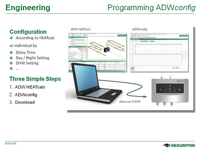 Sistemas simples podem ser configurados diretamente no aparelho sem usar um PC – nessa tarefa, o EasyConfig irá guiá-lo pelos passos individuais. A prática ferramenta de software ADW Config é usada para sistemas mais complexos e adaptações específicas a aplicações. Amplas funções de análise e opções de configuração asseguram a operação segura e econômica do seu sistema. A uniformidade de ambas as ferramentas de software é outra vantagem. A configuração do aparelho calculada pelo ADW HeatCalc pode ser salva como um arquivo diretamente no aparelho usando o ADW Config.